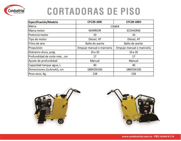 La cortadora de piso CIMAR CFC20-10EH tiene diseño tradicional y robusto. Está equipada con un motor diésel de cuatro tiempos ECOHORSE de 10HP. Ideal para hacer juntas de dilatación, cortes para zanjas para instalar tuberías, re parcheo, etc.